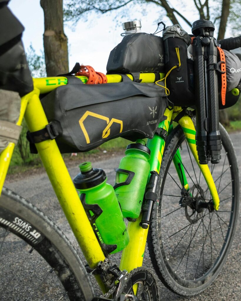 Rahmentasche (Framebag): Hier verstauen wir alles Schwere, wie das Fahrradwerkzeug, das Wasserreservoir (Trinkblase) oder schwere Verpflegung. Durch die tiefe, mittige Platzierung optimierst du den Schwerpunkt deines Rades. Zusätzlich empfehle ich hier Dinge zu verstauen, an die du tendenziell öfter ran musst, da der Zugang hier deutlich einfacher ist, als bspw. in der Satteltasche zu graben.